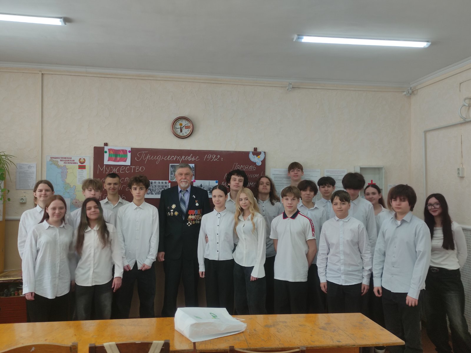 В рамках ежегодного проекта в МОУ «БСОШ №15» прошли классные часы с приглашёнными почётными гостями — участниками и свидетелями важнейших исторических событий: Великой Отечественной войны, войны в Афганистане и войны 1992 года в Приднестровье. Среди приглашенных гостей- Председатель Координационного Совета ОНФ Анатолий Булда, Председатель Союза ветеранов УВД г.Бендеры Виктор Паскарь, а также защитница Приднестровья- Ангелина Огли.