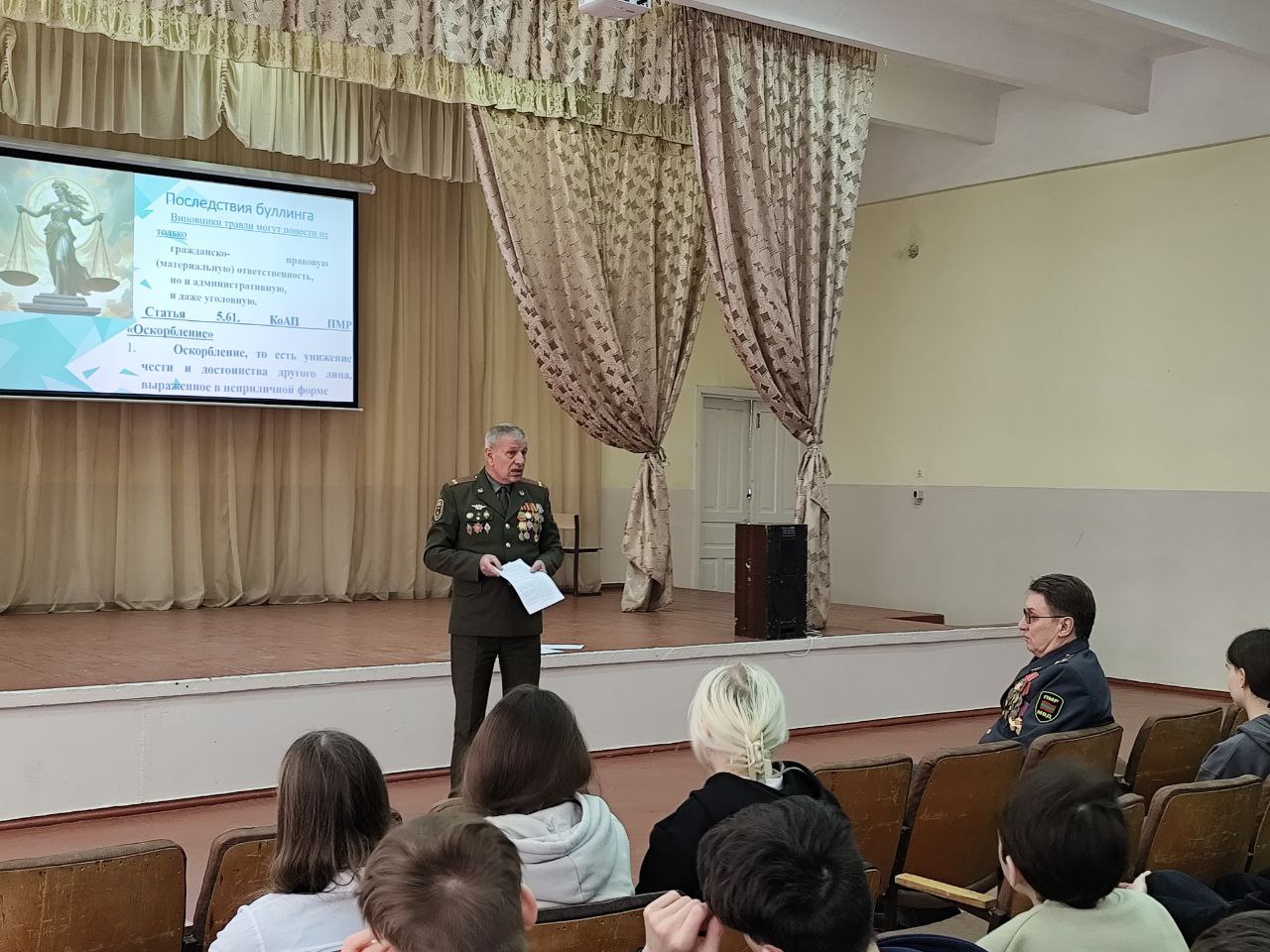 В Бендерской 18-й школе прошёл классный час, посвящённый профилактике травли среди подростков. Во встрече приняли участие члены ОНФ- председатель Совета ветеранов УВД г. Бендеры Виктор Паскарь и его заместитель Олег Орлов.